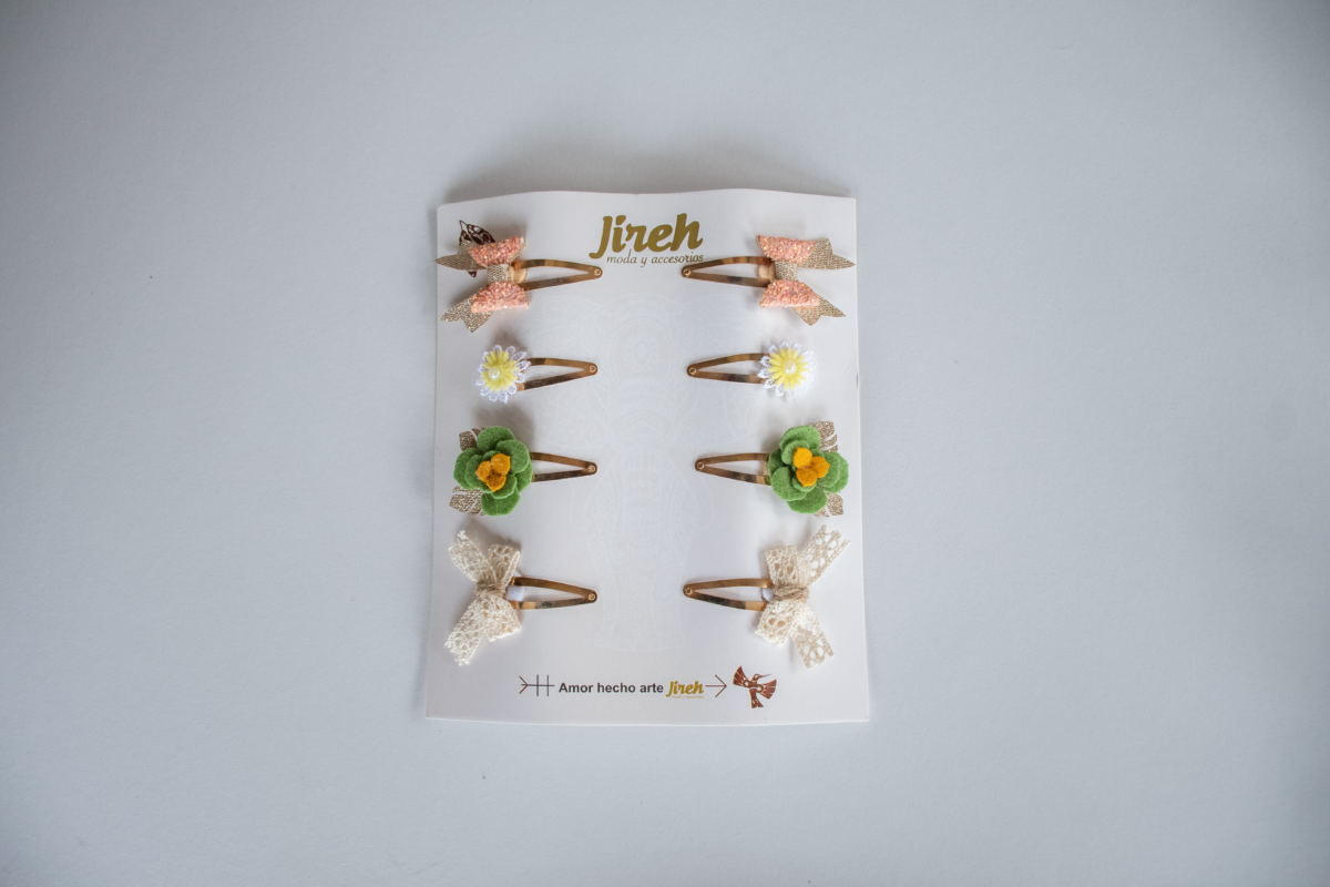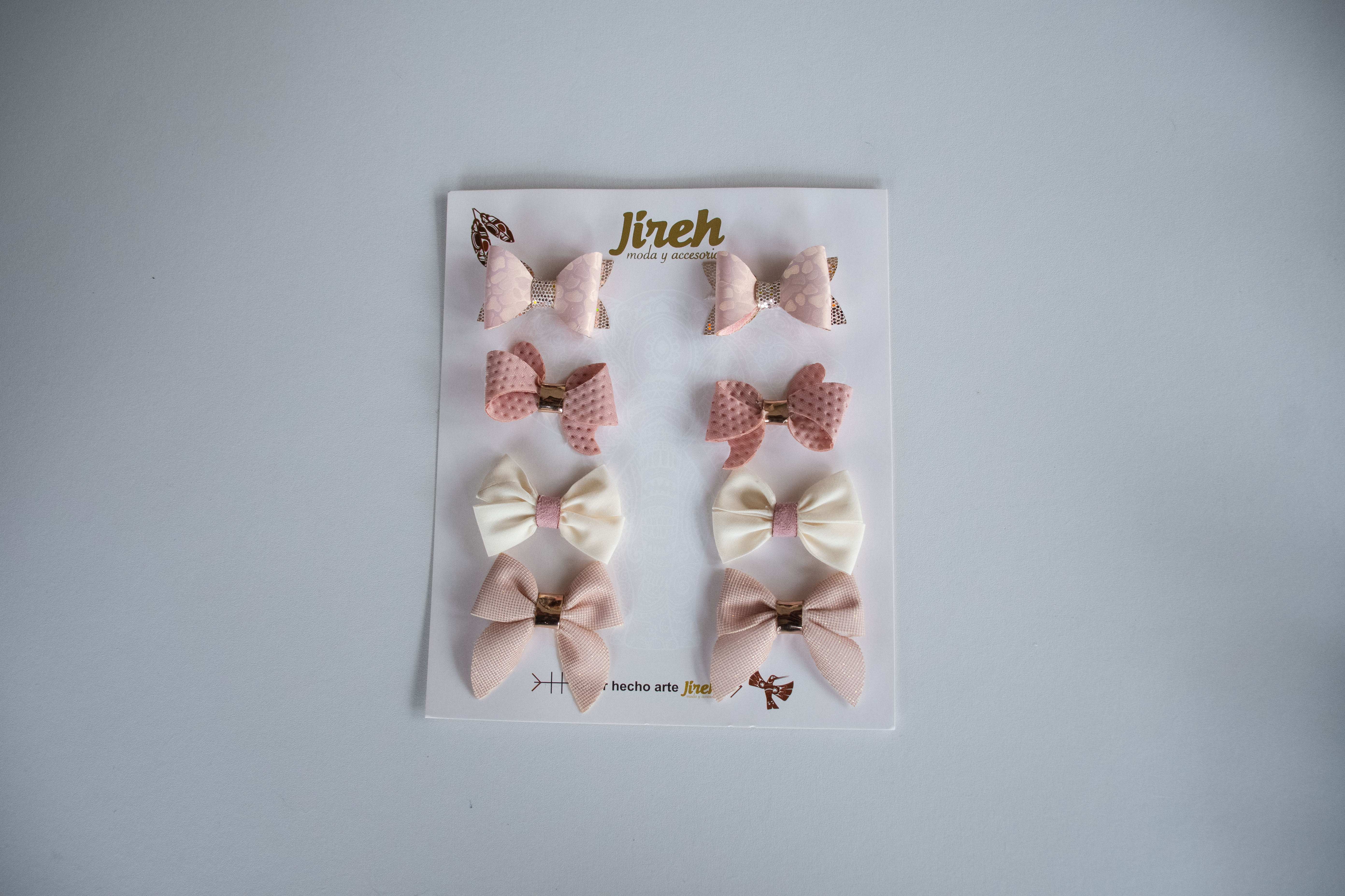 Dale un toque especial a los accesorios de tu bebé con este encantador set de moños. Cada paquete incluye 4 pares (8 piezas en total) con diseños únicos: